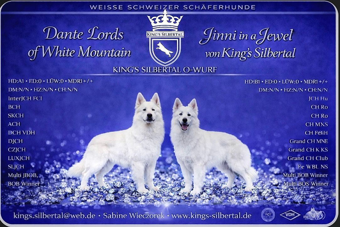 Auf unseren O-Wurf freuen wir uns ganz besonders, denn es wird der 3. und letzte Wurf für unsere Jinni in a Jewel aka Jule sein. Vater des Wurfes ist Dante Lords of White Mountain, ein überaus erfolgreicher Rüde, der auf internationalem Parkett zu glänzen weiß und auf der ganz großen Bühne tolle Erfolge errungen hat. In Gesundheit, Wesen und Schönheit können wir ganz gewiss von einer Traumverpaarung sprechen.
